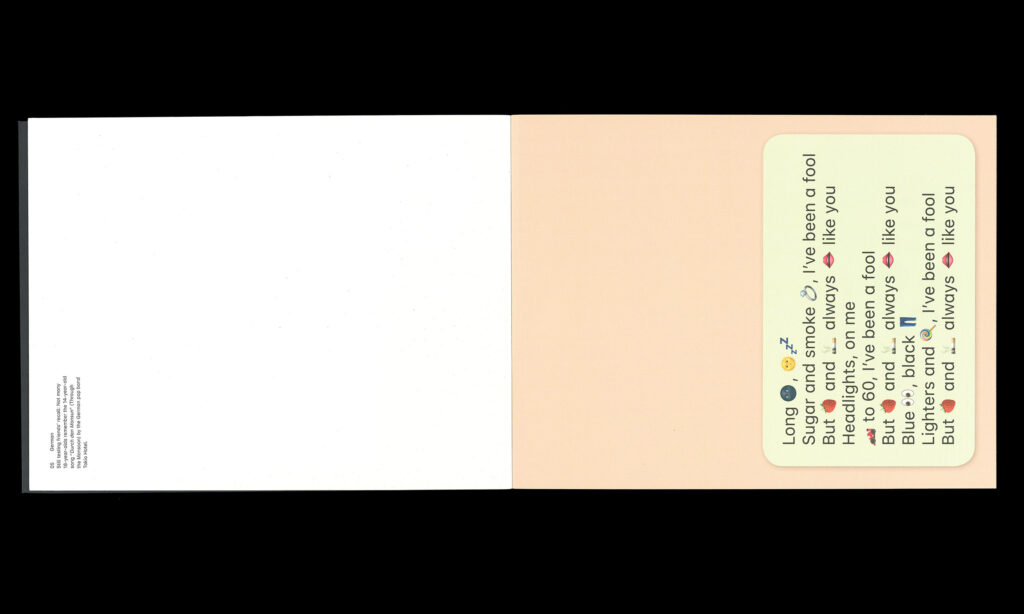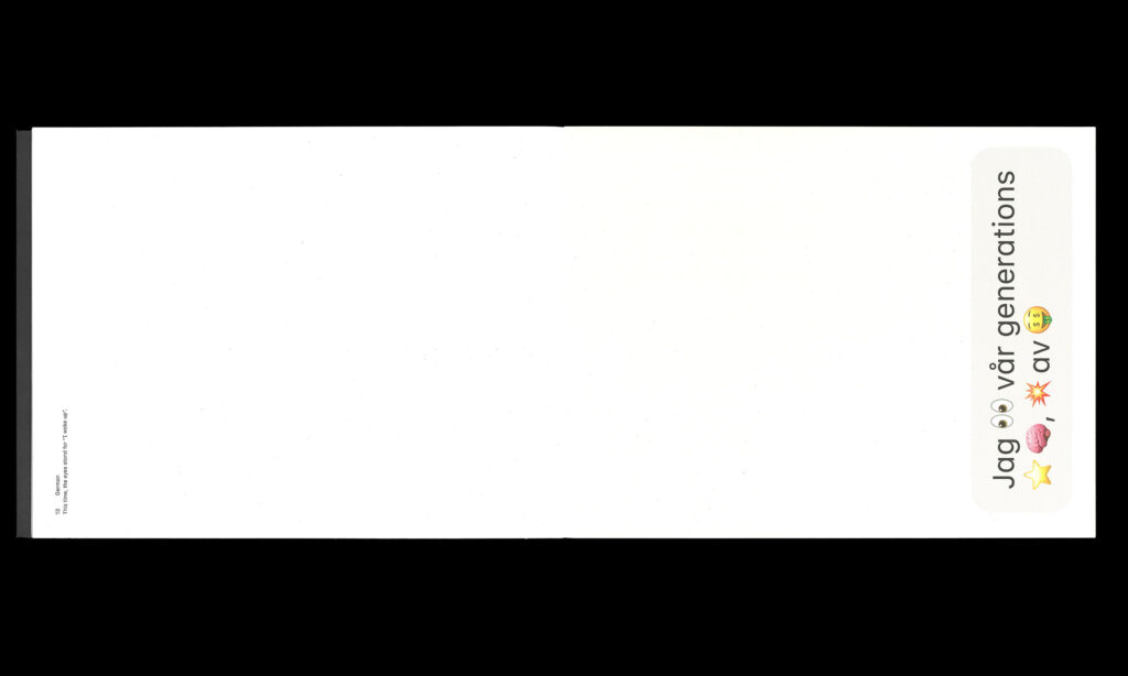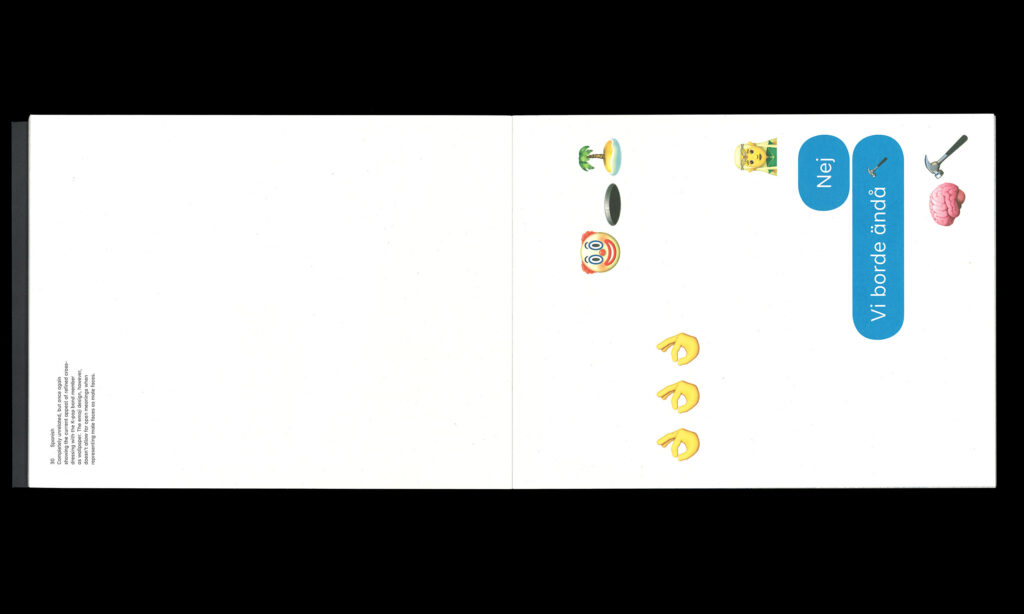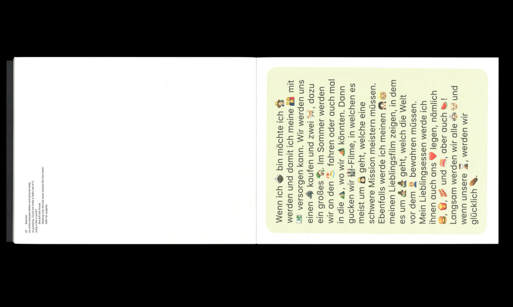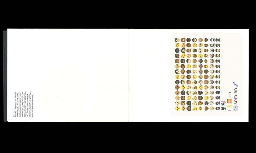 This publication belongs to a set of materials produced in reference to the transformative developments occurring in the realm of writing and speaking today, as triggered by digital communication. These shifts are part of a cultural process, shaped by structural multilingualism, which is impacting many parts of the world. Edited by Hinrich Sachs and Fredrik Ehlin,👂🧠👀📋 is a compilation of text messages by student contributors from various schools, who have diverse backgrounds in speaking German, Spanish, Basque, Swedish, Swiss-German, Japanese, Korean, and Chinese. Each cryptic, emoticon-laden text message is accompanied by its “translation”.