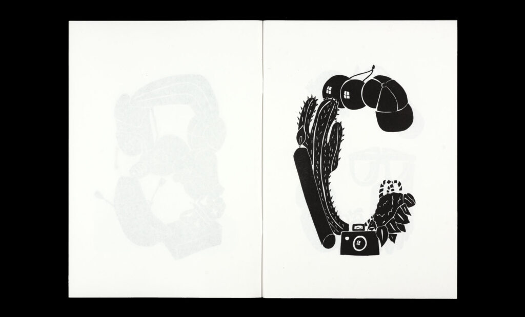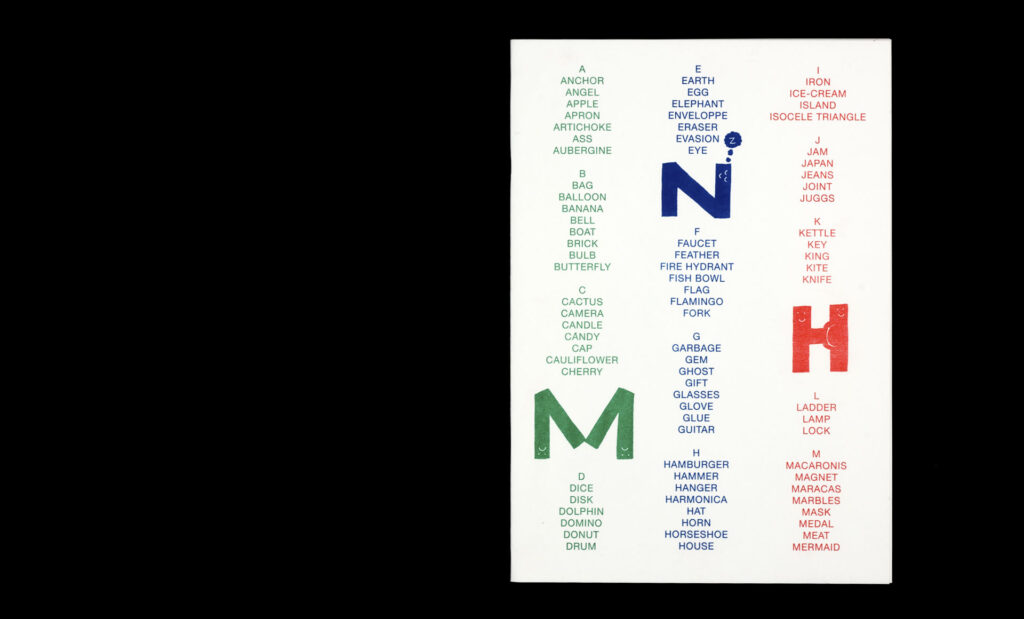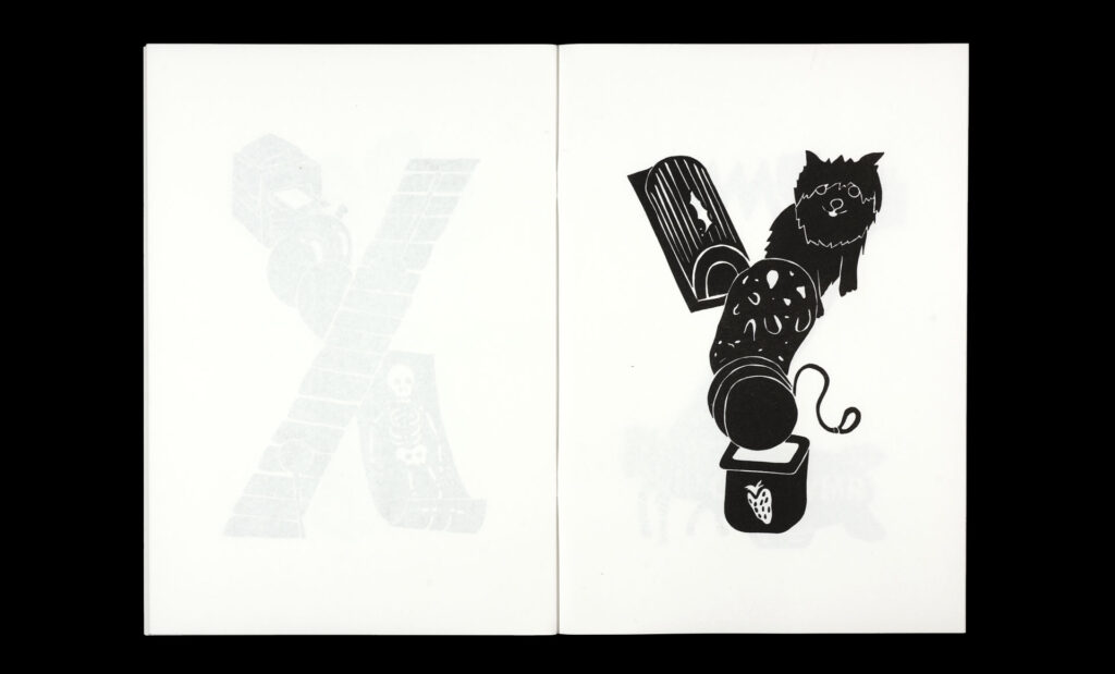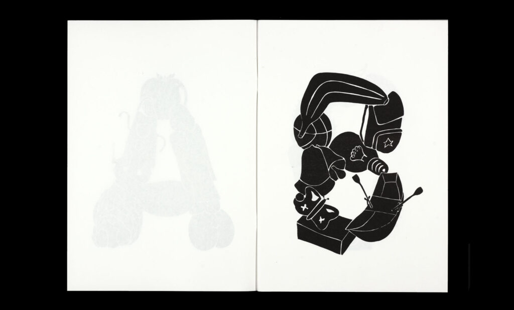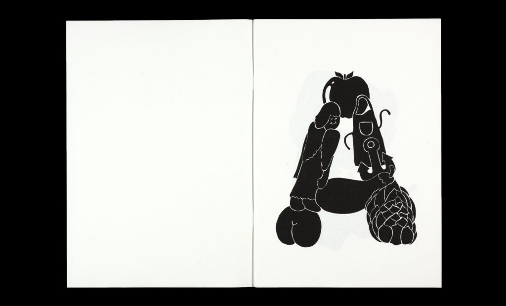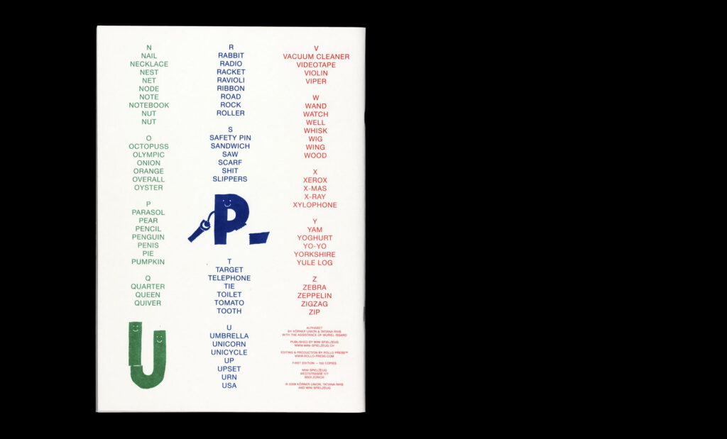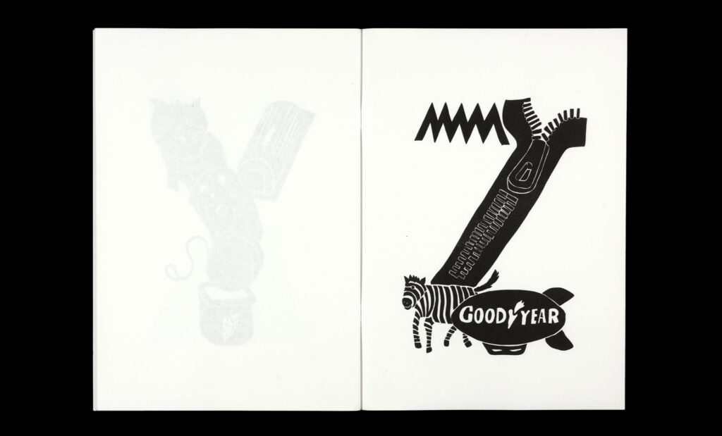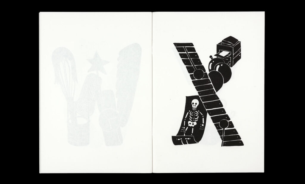Within the pages of their risograph-printed alphabet book, Körner Union and Tatiana Rihs build letters out of odd accretions of recognizable objects, rendered in bold black shapes. The letter ‘I’, for example, is a tower composed of an isosceles triangle, ice cream cone, island, and iron. With a three-color printed cover listing every element of the 26 compositions.