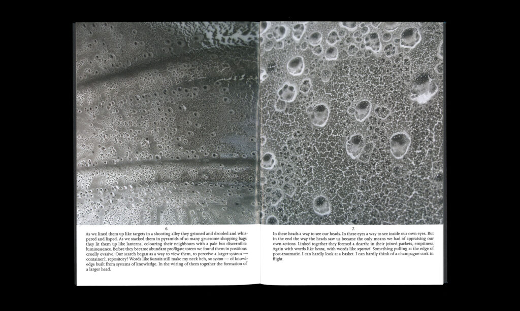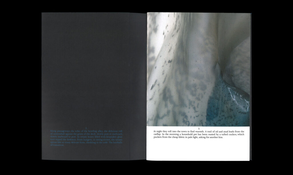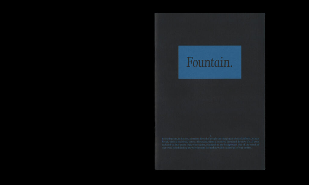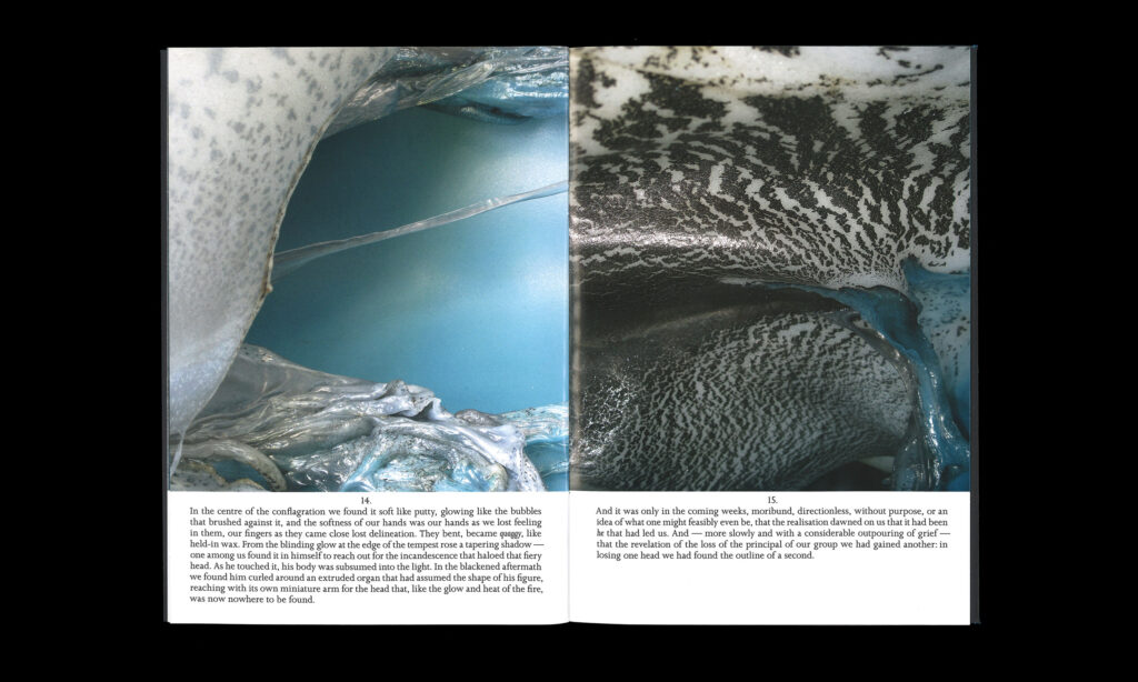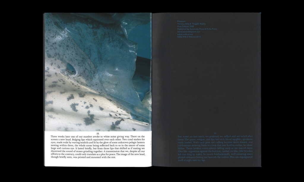 Vanessa Billy is a Swiss artist whose work utilises a wide variety of materials, such as bronze, silicone, bio-resin, metals, glass and plastics. Within her practice she addresses broader concerns regarding human consumption by including industrial products and objects, drawing parallels between physical and mental constructs and thereby also posing questions about the impact of human activity and its effects on life on our planet. ‘Fountain’ comprises a series of highly detailed, close-up and abstract images of various surfaces and shapes that have a fluid quality, reminiscent in colour and form to water or ice. The series is accompanied by a commissioned text by Thogdin Ripley.