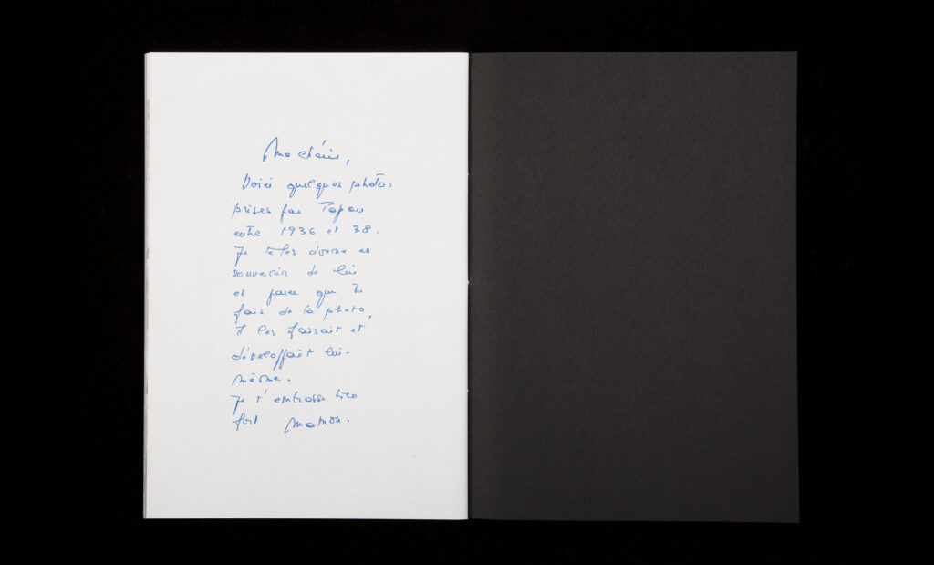“Ma chérie, voici quelques photos prises par Papou entre 1936 et 38. Je te les donne en souvenir de lui et parce que tu fais de la photo, il les faisait et développait lui-même. Je t’embrasse très fort, Mamou.”