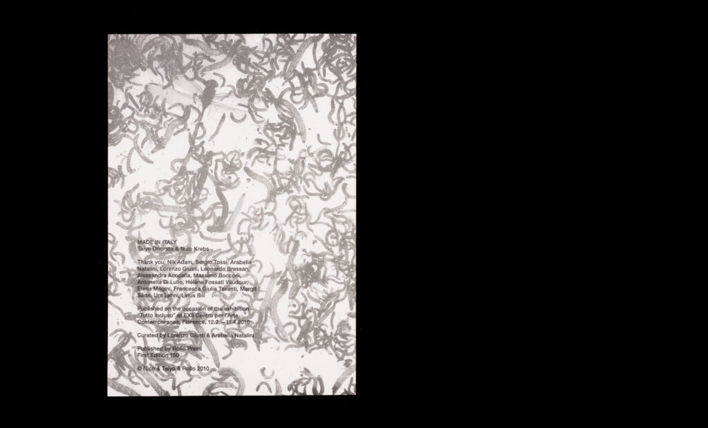 Published on the occasion of the exhibition “Tutto incluso” by Taiyo Onorato and Nico Krebs at EX3 Centro per l’Arte Contamporanea, Florence, 12.2.–11.4.2010.