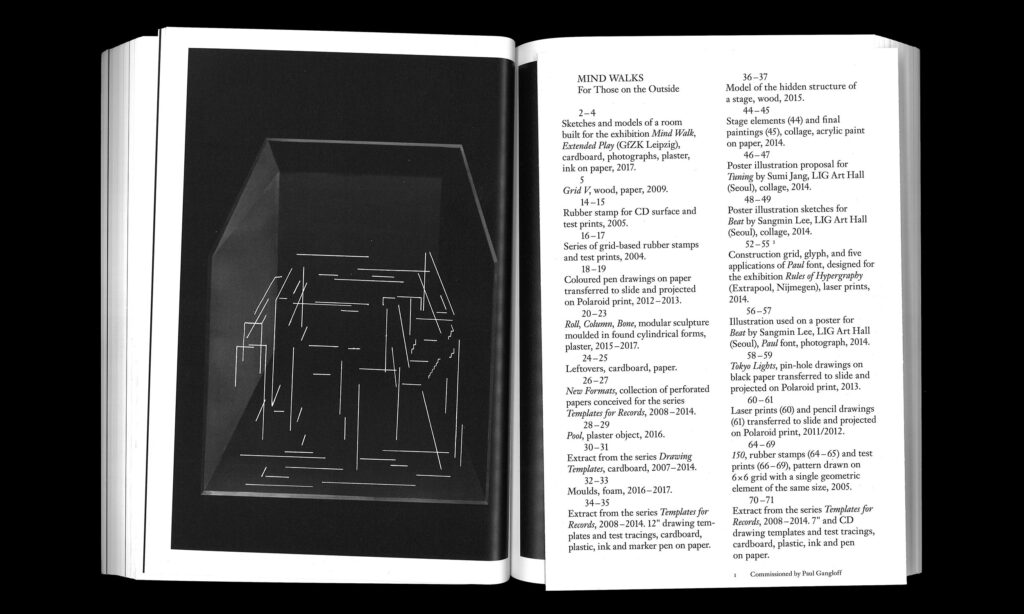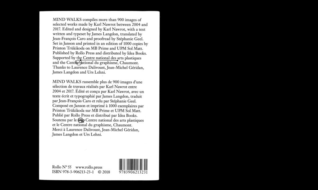 Karl Nawrot’s work includes drawing, painting, sculptural model-making, and typeface design. ‘Mind Walks’ compiles over 900 images of selected works from 2004 to 2017. Nawrot’s studio practice and commissioned works, seen together here for the first time, make a consistent aesthetic proposition. Cryptic, cave-like architectures and recurring, monotone drawings (made with his own stencils and other graphic devices) create a sense of strange, uncomfortable, wonder. Edited and designed by Nawrot, with a text by James Langdon.