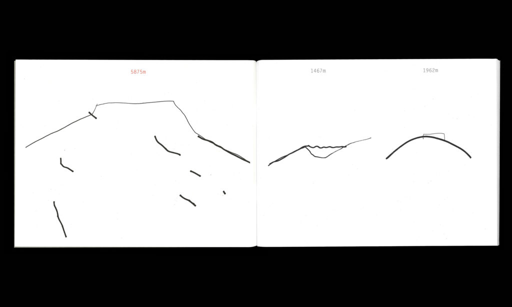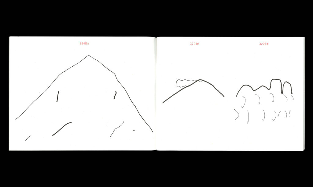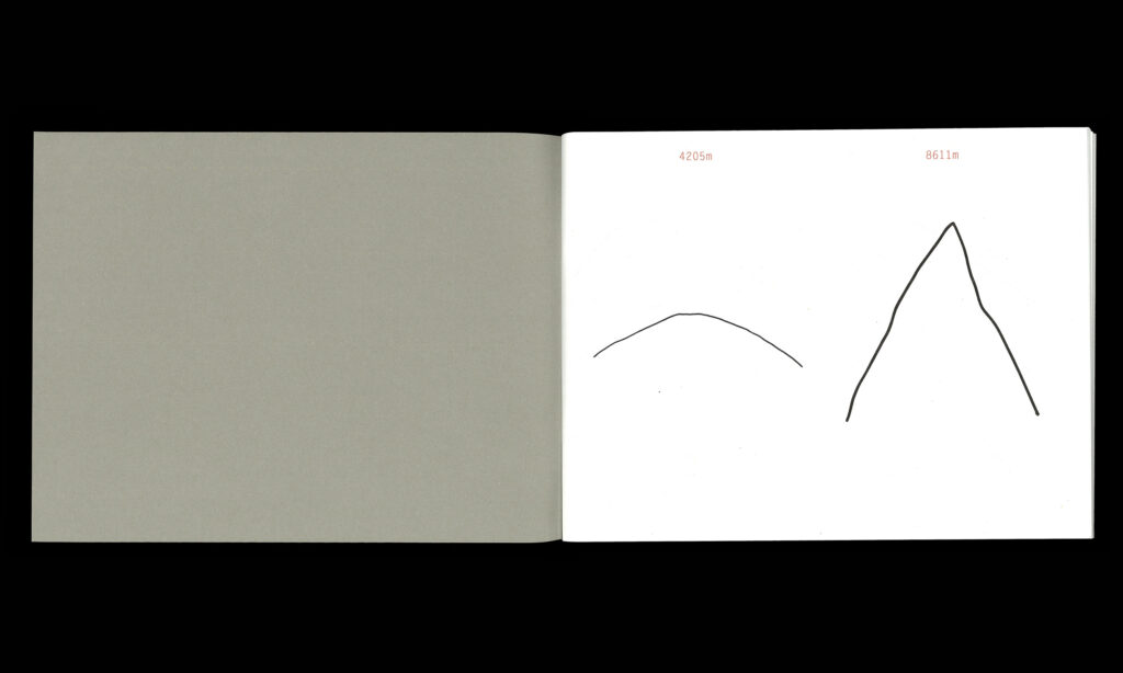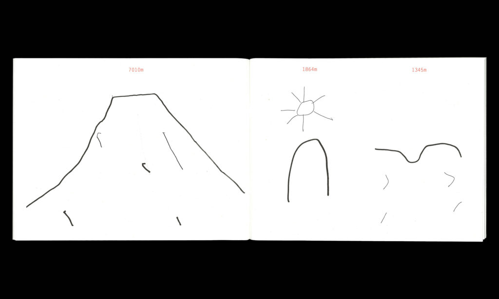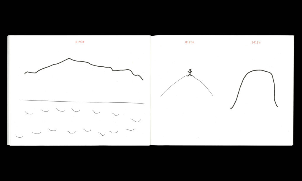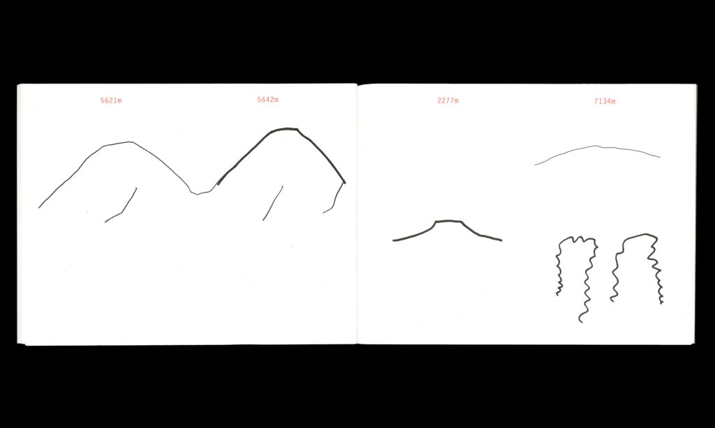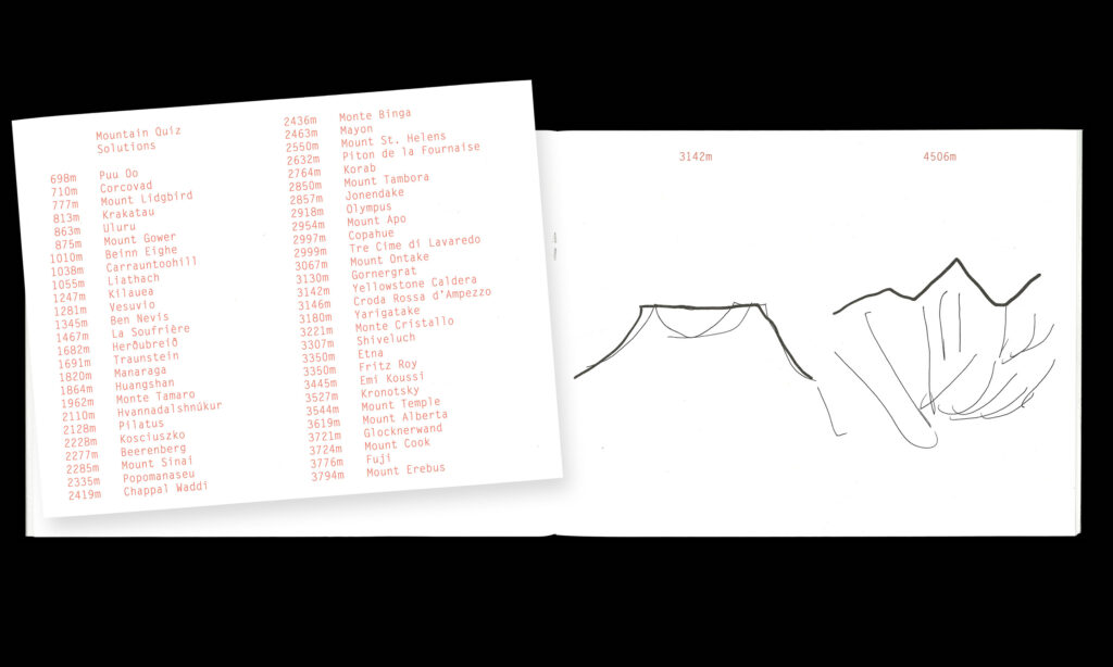 Born in Kobe, artist Masanao Hirayama creates works that are disarmingly simple, with childlike lines and abstractly sketched forms. “Mountain Quiz” comprises a series of untitled drawings of notable mountains. The only clue he gives as to their identity is the elevation. From famous peaks like Everest, Kilimanjaro, Fuji, and the Matterhorn, to volcanoes such as Mauna Kea, Mount St. Helens, Vesuvius, and Krakatau, and a long list of lesser-known mountains, Hirayama diligently draws the most recognisable features of each landmark. He even includes a wild card, which turns out to be the tallest planetary mountain in the solar system. A paperboard insert lists the answers.