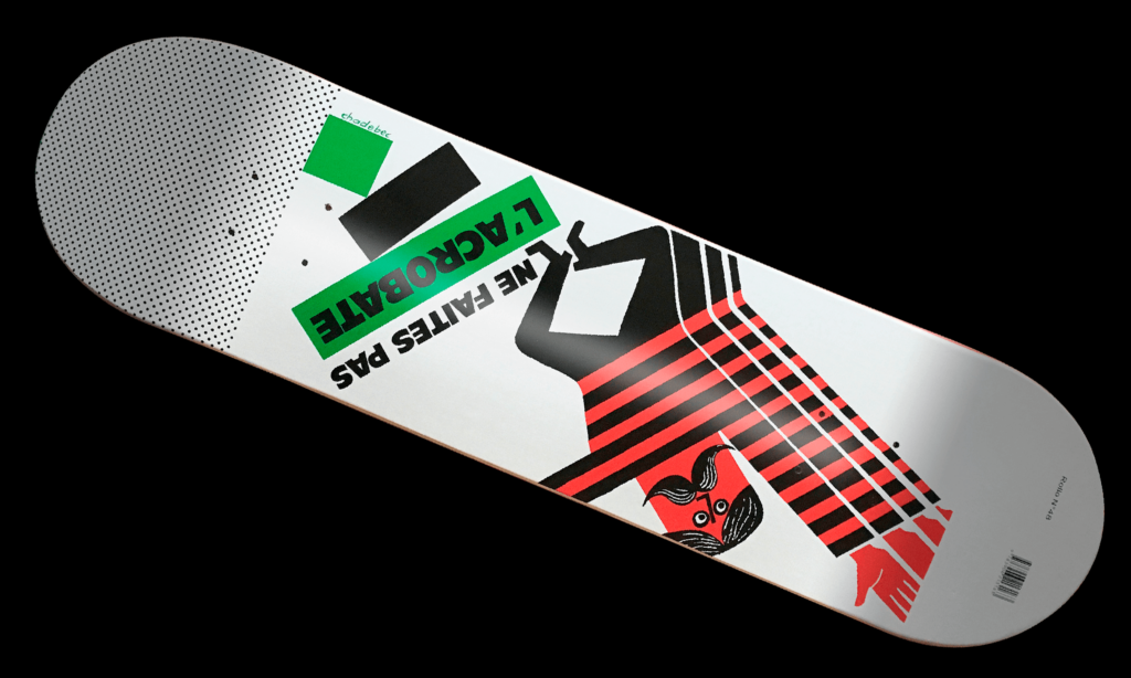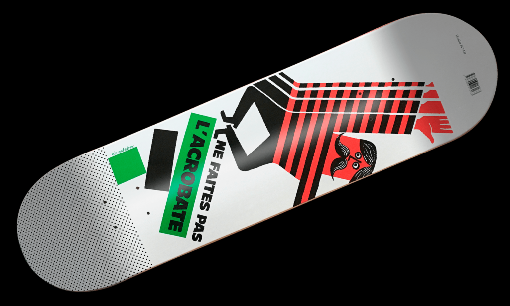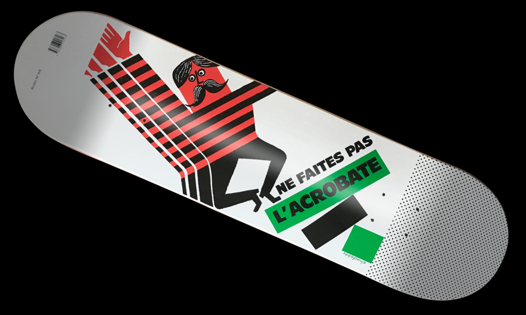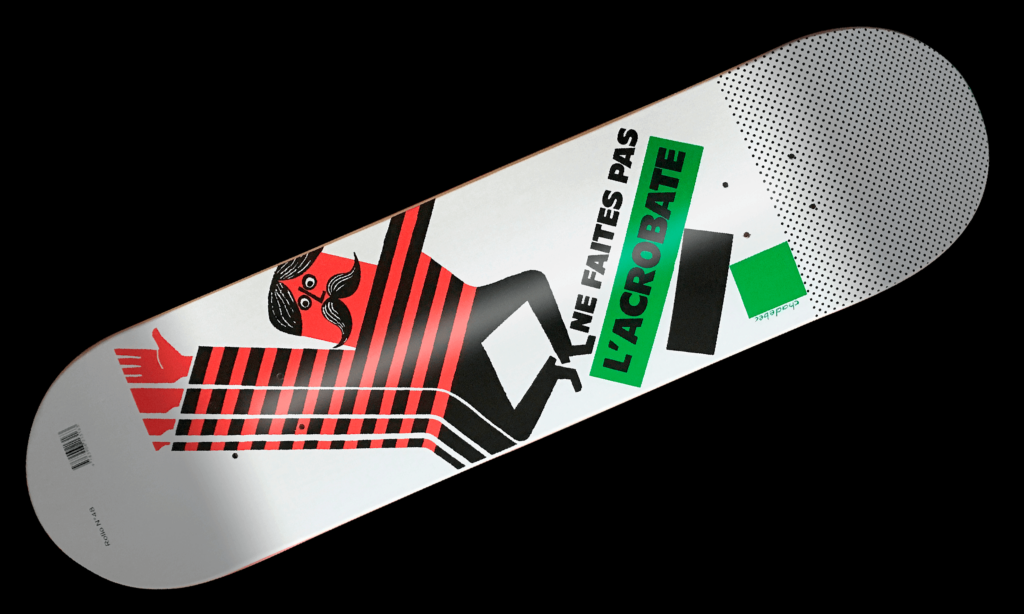 In the context of the release of “Intrus Sympathiques” by Bernard Chadebec we decided to print one of his iconic posters on a skateboard. It’s a proper street deck, 8 inches wide with a medium concave — tested and approved by skaters all around the globe. Ne faits pas l’acrobate!