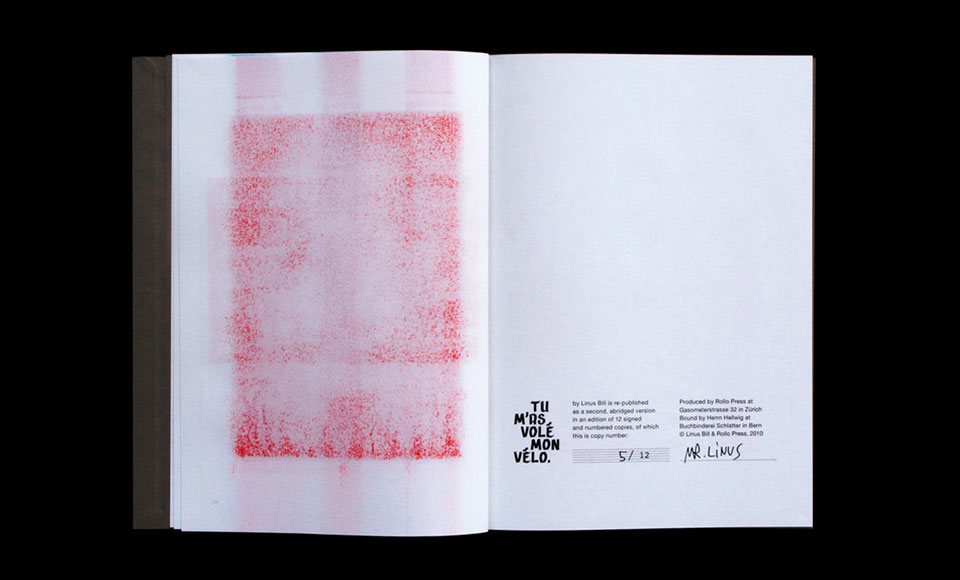 Instead of a regular reprint of “Tu M’as Volé Mon Vélo”, Linus Bill decided to produce an abridged version, compressing each colored section of 25 images onto one sheet of paper. The amount of print runs and the work spent on printing was similar to a regular reprint, however, the result is all together completely different.