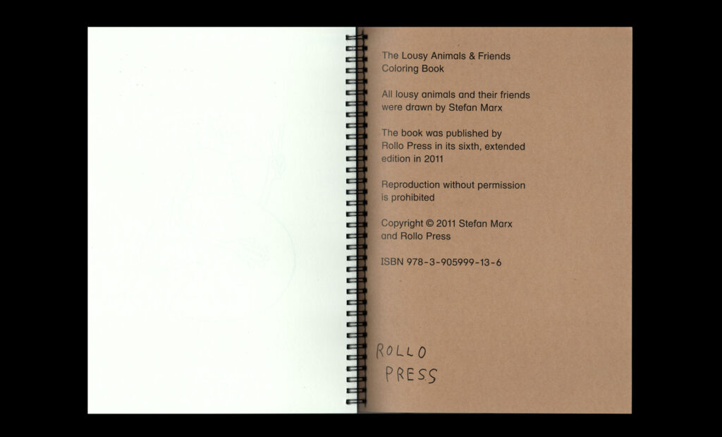 Stefan Marx’ coloring book was the first publication ever to be released by Rollo Press in early 2008. Since then, due to popular demand, it has been extended and reprinted using the risograph for five times, adding up to a total print run of 1000 copies. In early 2012, we released this offset version, which features a whole bunch of new animals as well as it marks a step forward in terms of the object, employing a silkscreend hard cover and semi-concealed wire-o binding.