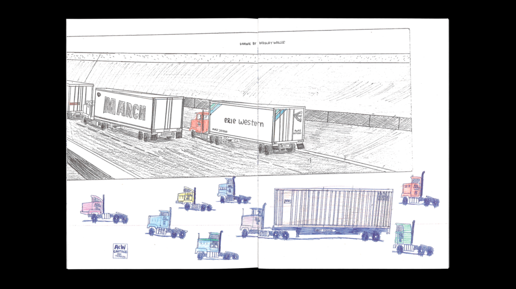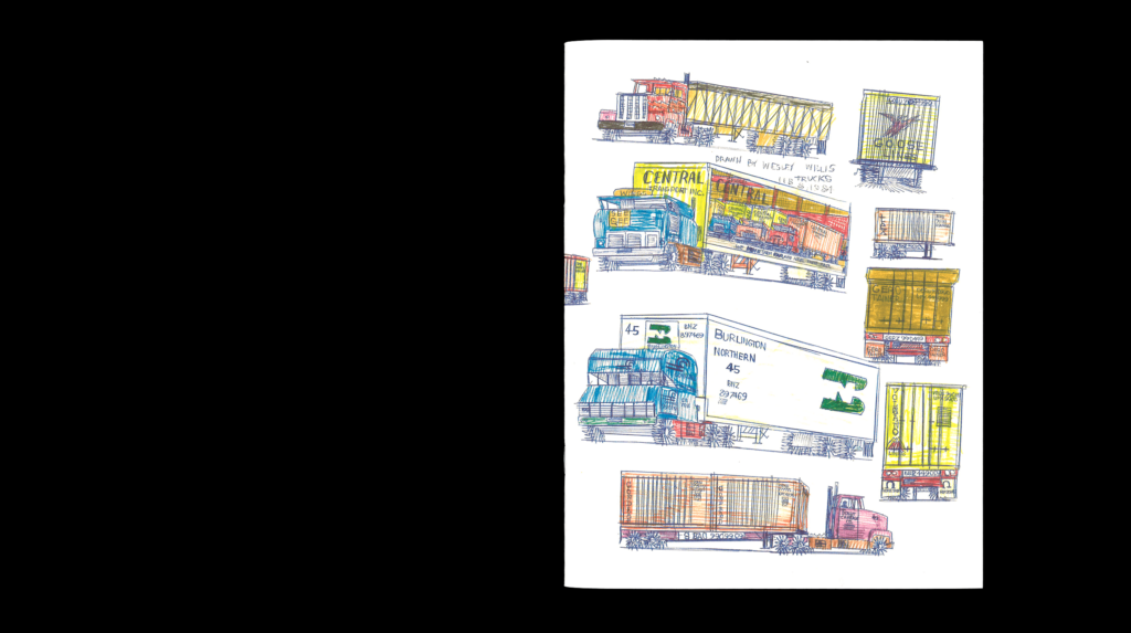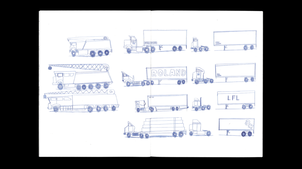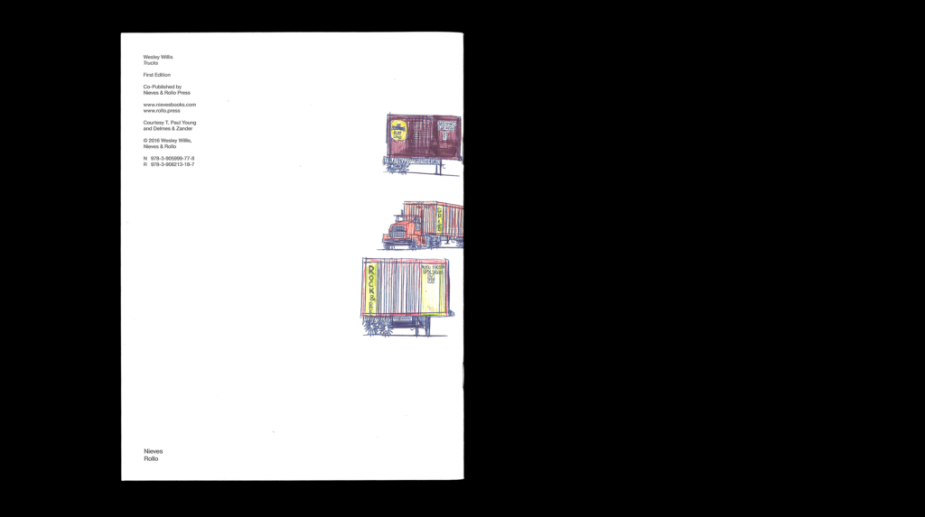 Wesley Willis (Chicago, 1963 – 2003) began his artistic career singing on the street, accompanied by his Technics KN 2000 keyboard. He was soon playing opening slots for local bands, and later recording songs as an homage to these performances (i.e. “Urge Overkill”, “Swervedriver”, “Foo Fighters”, “The Frogs”). In 1989, Willis was diagnosed as schizophrenic; he explains that writing, performing, and recording help quiet the voices in his head. Rollo Press is preparing an extensive book about the work of Wesley, scheduled for release in 2017, maybe 2018. Trucks is co-published with Nieves.